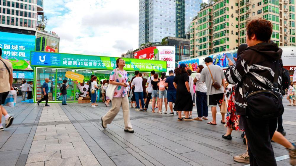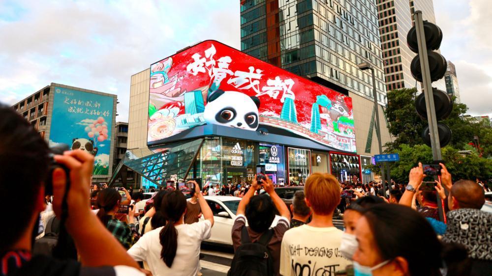 (上图:成齐街头的3D屏幕正在播放大运会宣传片,稠密市民容身不雅看。照相:本报记者梁远浩)